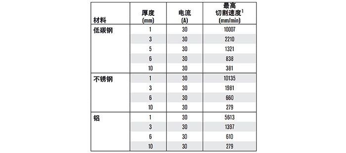 最大切割速度是根據(jù) Hypertherm 實(shí)驗(yàn)室測試所得的結(jié)果。為達(dá)到最佳切割性能,各種切割應(yīng)用的實(shí)際切割速度可能有所不同。有關(guān)更多詳情,請參考《操作源手冊》。