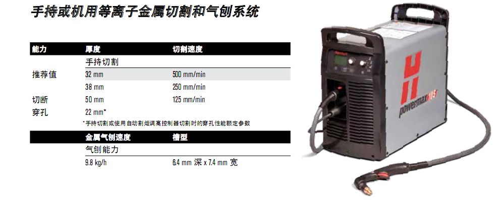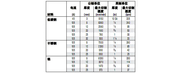 最大切割速度系根據(jù) Hypertherm 實驗室測試所得的結果。為實現(xiàn)最佳切割性能,實際切割速度可能會隨不同的切割應用而有所不同。有關更多詳情,請參考《操作手冊》。